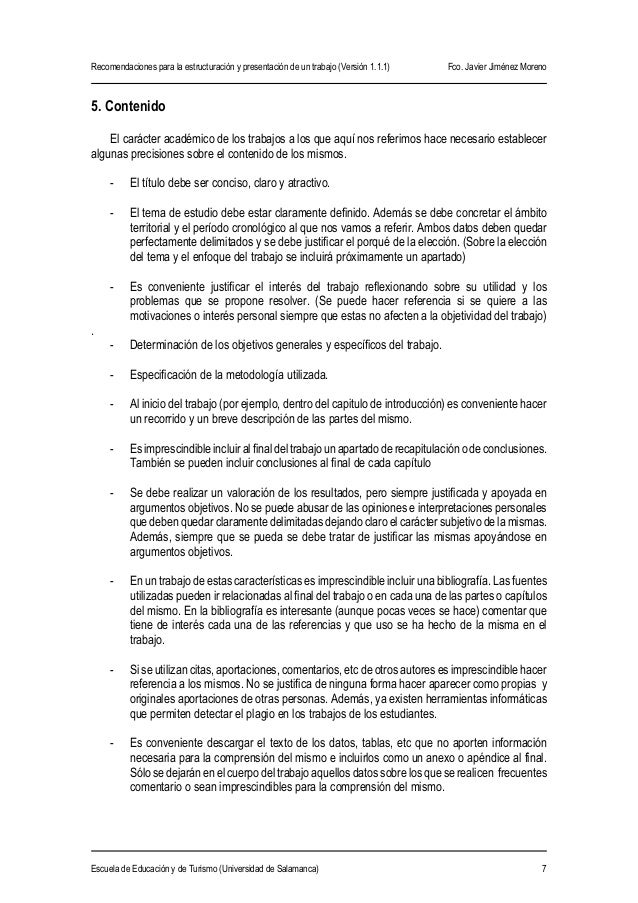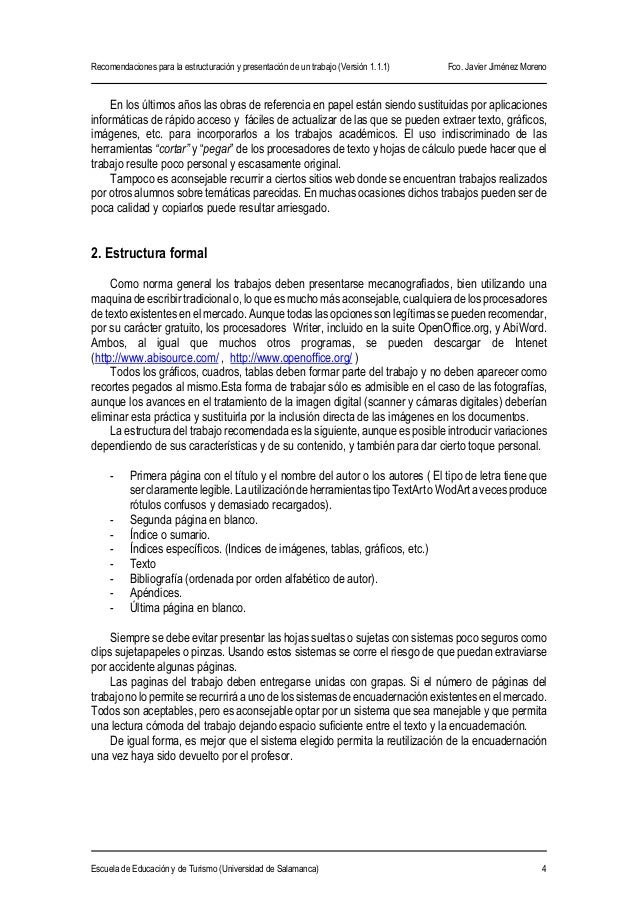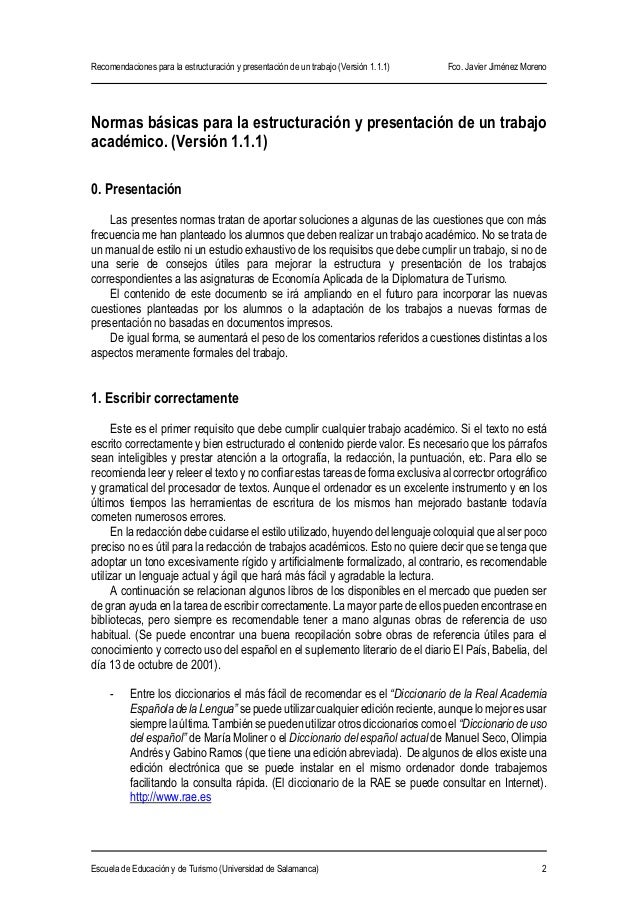 - 1. Recomendaciones para la estructuración y presentación de un trabajo (Versión 1.1.1) Fco. Javier Jiménez MorenoEscuela de Educación y de Turismo (Universidad de Salamanca) 1Recomendaciones para laestructuración y presentación de untrabajo académico.(Versión 1.1.1)Francisco Javier Jiménez MorenoUniversidad de Salamanca(Departamento de Economía Aplicada)