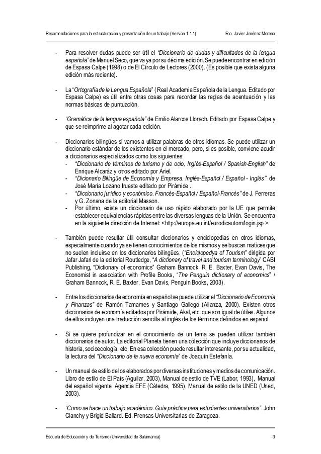 - 3. Recomendaciones para la estructuración y presentación de un trabajo (Versión 1.1.1) Fco. Javier Jiménez MorenoEscuela de Educación y de Turismo (Universidad de Salamanca) 3- Para resolver dudas puede ser útil el “Diccionario de dudas y dificultades de la lenguaespañola” de Manuel Seco, que va ya por su décimaedición.Sepuedeencontrarenediciónde Espasa Calpe (1998) o de El Círculo de Lectores (2000). (Es posible que exista algunaedición más reciente).- La“OrtografíadelaLenguaEspañola”(RealAcademiaEspañoladelaLengua.EditadoporEspasa Calpe) es útil entre otras cosas para recordar las reglas de acentuación y lasnormas básicas de puntuación.- “Gramática de la lengua española” de Emilio Alarcos Llorach. Editado por Espasa Calpe yque se reimprime al agotar cada edición.- Diccionarios bilingües si vamos a utilizar palabras de otros idiomas. Se puede utilizar undiccionario estándar de los existentes en el mercado, pero, si es posible, conviene acudira diccionarios especializados como los siguientes:- “Diccionario de términos de turismo y de ocio, Inglés-Español / Spanish-English” deEnrique Alcaráz y otros editado por Ariel.- “Dicionario Bilingüe de Economía y Empresa. Inglés-Español / Español - Inglés”” deJosé María Lozano Irueste editado por Pirámide .- “Diccionario jurídico y económico. Francés-Español / Español-Francés” de J. Ferrerasy G. Zonana de la editorial Masson.- Por último, existe un diccionario de uso rápido elaborado por la UE que permiteestablecer equivalencias rápidas entre las diversas lenguas de la Unión. Se encuentraen la siguiente dirección de Internet: .- También puede resultar útil consultar diccionarios y enciclopedias en otros idiomas,especialmente cuando ya se tienen conocimientos de los mismos y se buscan matices queno suelen incluirse en los diccionarios bilingües. (“Enciclopedya of Tourism” dirigida porJafar Jafari de la editorial Routledge, “A dictionary of travel and tourism terminology” CABIPublishing, “Dictionary of economics” Graham Bannock, R. E. Baxter, Evan Davis, TheEconomist in association with Profile Books, “The Penguin dictionary of economics” /Graham Bannock, R. E. Baxter, Evan Davis, Penguin Books, 2003).- Entrelosdiccionariosdeeconomíaenespañolsepuedeutilizarel“DiccionariodeEconomíay Finanzas” de Ramón Tamames y Santiago Gallego (Alianza, 2000). Existen otrosdiccionarios de economía editados por Pirámide, Akal, etc. que son igual de útiles. Algunosde ellos incluyen una traducción sencilla al inglés de los términos definidos en español.- Si se quiere profundizar en el conocimiento de un tema se pueden utilizar tambiéndiccionarios de autor. La editorial Planeta tienen una colección que incluye diccionarios dehistoria, socioecología, etc. En esa colección puede resultar interesante, por su actualidad,la lectura del “Diccionario de la nueva economía” de Joaquín Estefanía.- Unmanualdeestilodeloselaboradospordiversasinstitucionesymediosdecomunicación.Libro de estilo de El País (Aguilar, 2003), Manual de estilo de TVE (Labor, 1993), Manualdel español vigente. Agencia EFE (Cátedra, 1995), Manual de estilo de la UNED (Uned,2003).- “Como se hace un trabajo académico. Guía práctica para estudiantes universitarios”. JohnClanchy y Brigid Ballard. Ed. Prensas Universitarias de Zaragoza.