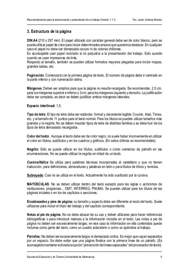 - 5. Recomendaciones para la estructuración y presentación de un trabajo (Versión 1.1.1) Fco. Javier Jiménez MorenoEscuela de Educación y de Turismo (Universidad de Salamanca) 53. Estructura de la páginaDIN A4 (210 x 297 mm). El papel utilizado con carácter general debe ser de color blanco, pero sepuede utilizar papel de color para incluir determinados anexos que queramos destacar. En cualquiercaso el papel no debe ser demasiado oscuro ni de colores chillones.Es aconsejable usar papel reciclado si no perjudica a la presentación del trabajo. Esto sucedecuando se usan impresoras de tinta.Respecto al tamaño, también se pueden utilizar formatos mayores plegados para incluir mapas,grandes tablas, etc.Paginación: Comenzará con la primera página de texto. El número de página debe ir centrado enla parte inferior y con numeración latina.Márgenes. Deben ser amplios para que la página no resulte recargada. Se recomiendan, 2,5 cm.para los márgenes superior e inferior y 3 cm. para los márgenes izquierdo y derecho. La justificacióndebe ser completa, es decir se deben justificar ambos márgenes laterales.Espacio interlineal: 1,5.Tipo de letra: El tipo de letra debe ser estándar, formal y claramente legible: Courier, Arial, Times,etc. y el tamaño de 11 puntos para el texto normal. Para los títulos se pueden utilizar tamaños másgrandes y la negrita. No se deben mezclar tipos de letra de distintas familias y se debe huir de lostipos de letra demasiado recargados.Color del texto: Aunque el texto debe ser de color negro, no suele haber inconveniente en utilizarel color en títulos, subtítulos y en los cuadros y gráficos. (En estos últimos es recomendable).Negrita: Sólo se puede utilizar en los títulos, subtítulos o como comienzo de párrafo en lasenumeraciones. No se puede utilizar la negrita en mitad de un texto.Cursiva/Itálica Se utiliza para palabras técnicas incorporadas al castellano y que no tienentraducción, para definiciones, abreviaturas y palabras en latín o para títulos de libros y revistas.Subrayado: Casi no se utiliza en el texto. Actualmente ha sido sustituido por la cursiva.MAYÚSCULAS: No se deben utilizar dentro del texto excepto para las siglas o acrónimos deinstituciones, programas... OMT, INTERREG, PNUMA. Se pueden utilizar para los títulos de laspáginas iniciales o en los de capítulos o secciones.Encabezados y pies de página: su tamaño y aspecto debe ser diferente al resto del texto. Sueleutilizarse para incluir el titulo del trabajo y del capítulo correspondiente.Notas al pie de página. No se debe abusar de su uso y deben utilizarse para hacer referenciasbibliográficas o para introducir matices a la información incluida en el texto. Las notas a pie depágina no deben ser excesivamente largas; en ese caso la información en ella contenidas puedeincluirse como parte del texto, como un cuadro aclaratorio o como un apéndice al trabajo.Párrafos: No deben ser excesivamente largos ni demasiado cortos. Es mejor que vayan separadospor un espacio. Se debe evitar que una página finalice con la primera línea de un párrafo. (Esaconsejablemanteneractivadalaopción“prevencióndelíneasseparadas”delprocesadordetexto).