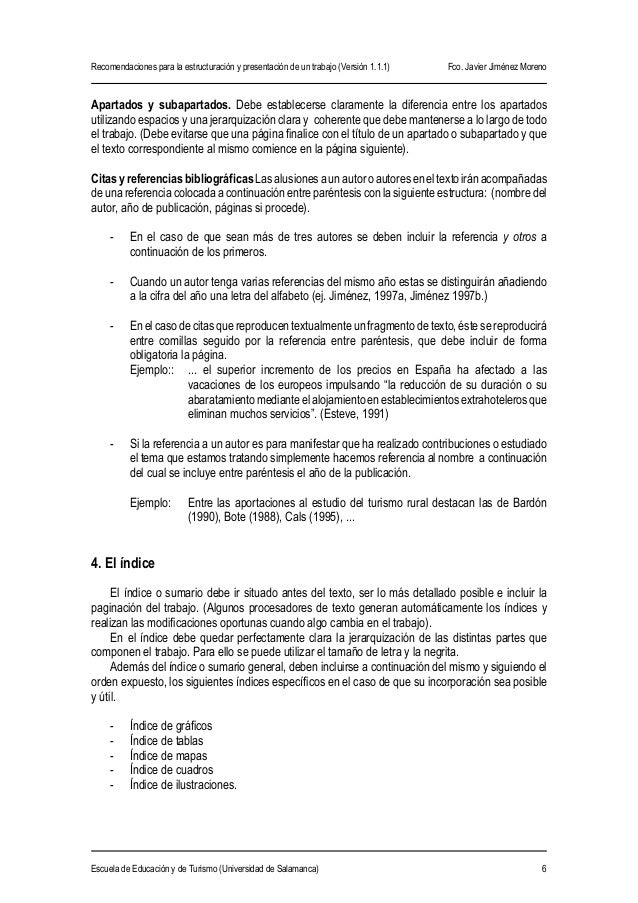 - 6. Recomendaciones para la estructuración y presentación de un trabajo (Versión 1.1.1) Fco. Javier Jiménez MorenoEscuela de Educación y de Turismo (Universidad de Salamanca) 6Apartados y subapartados. Debe establecerse claramente la diferencia entre los apartadosutilizando espacios y una jerarquización clara y coherente que debe mantenerse a lo largo de todoel trabajo. (Debe evitarse que una página finalice con el título de un apartado o subapartado y queel texto correspondiente al mismo comience en la página siguiente).Citasyreferenciasbibliográficas Lasalusionesaunautoroautoreseneltextoiránacompañadasde una referencia colocada a continuación entre paréntesis con la siguiente estructura: (nombre delautor, año de publicación, páginas si procede).- En el caso de que sean más de tres autores se deben incluir la referencia y otros acontinuación de los primeros.- Cuando un autor tenga varias referencias del mismo año estas se distinguirán añadiendoa la cifra del año una letra del alfabeto (ej. Jiménez, 1997a, Jiménez 1997b.)- En el caso de citas que reproducen textualmente un fragmento de texto, éste se reproduciráentre comillas seguido por la referencia entre paréntesis, que debe incluir de formaobligatoria la página.Ejemplo:: ... el superior incremento de los precios en España ha afectado a lasvacaciones de los europeos impulsando “la reducción de su duración o suabaratamientomedianteelalojamientoenestablecimientosextrahotelerosqueeliminan muchos servicios”. (Esteve, 1991)- Si la referencia a un autor es para manifestar que ha realizado contribuciones o estudiadoel tema que estamos tratando simplemente hacemos referencia al nombre a continuacióndel cual se incluye entre paréntesis el año de la publicación.Ejemplo: Entre las aportaciones al estudio del turismo rural destacan las de Bardón(1990), Bote (1988), Cals (1995), ...4. El índiceEl índice o sumario debe ir situado antes del texto, ser lo más detallado posible e incluir lapaginación del trabajo. (Algunos procesadores de texto generan automáticamente los índices yrealizan las modificaciones oportunas cuando algo cambia en el trabajo).En el índice debe quedar perfectamente clara la jerarquización de las distintas partes quecomponen el trabajo. Para ello se puede utilizar el tamaño de letra y la negrita.Además del índice o sumario general, deben incluirse a continuación del mismo y siguiendo elorden expuesto, los siguientes índices específicos en el caso de que su incorporación sea posibley útil.- Índice de gráficos- Índice de tablas- Índice de mapas- Índice de cuadros- Índice de ilustraciones.