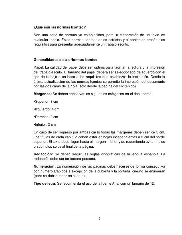 - 6. Normas ICONTEC (1486) trabajos escritos.Instituto colombiano de normas técnicas. 1. GENERALIDADES 1.1 Tipo de letra: arial 12 1.2 Interlineado: 1.5 1.3 Títulos centrados en hojas aparte en mayúscula 1.4 Subtítulos de primer nivel, contra el margen izquierdo y en mayúscula 1.5 Subtítulos de segundo nivel, contra el margen izquierdo y únicamente la primer letra en mayúscula. 1.6 Hojas tamaño carta 1.7 Impresión a una sola cara 1.8 Texto: justificado 1.9 Redacción impersonal y genérica 1.10 Numeración: centrada en forma consecutiva a partir de la introducción. La cubierta y la potada no se enumeran pero si se cuentan, por lo tanto la enumeración debe iniciar en 3. 1.11 Márgenes: Superior: 3cm Inferior: 3cm Izquierdo: 4cm Derecho: 2cm 6
